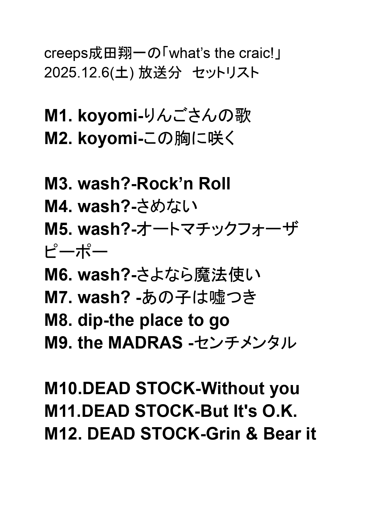 少し遅くなってしまいましたが、先日のラジオの選曲リストです。